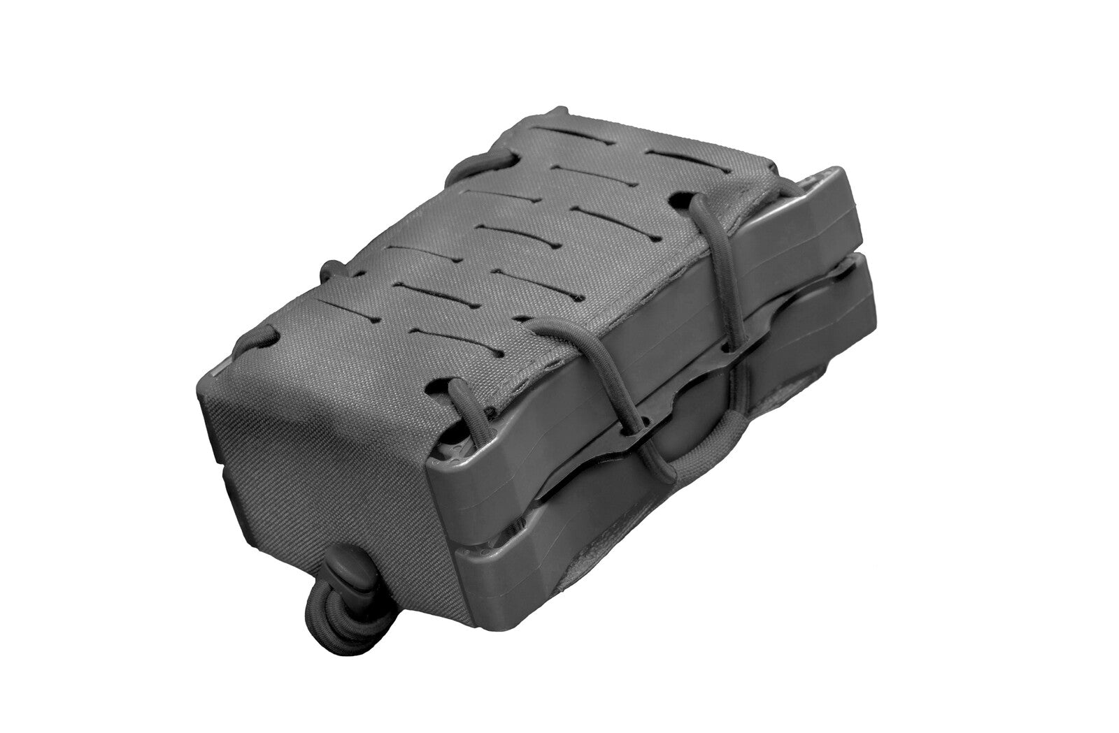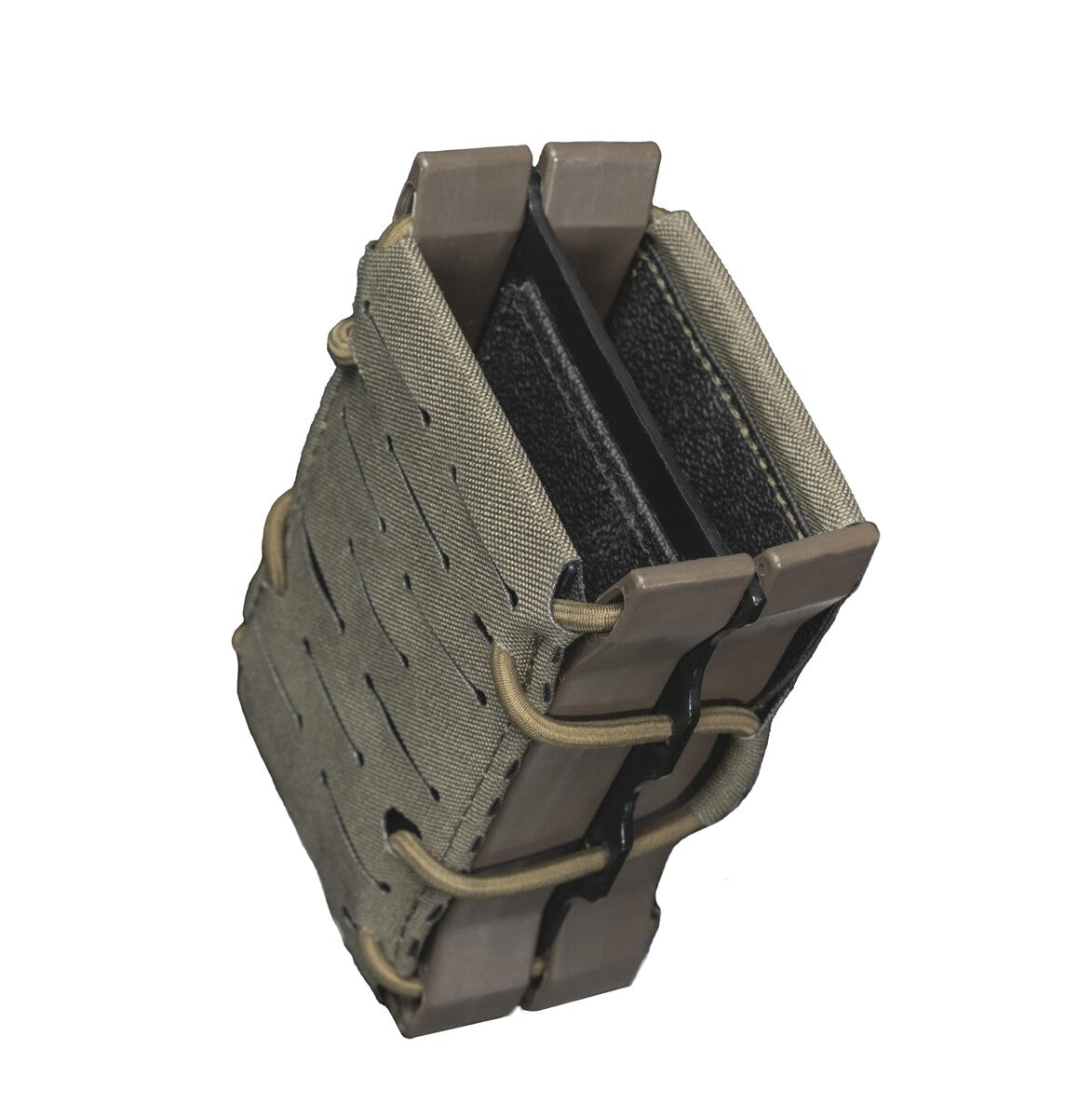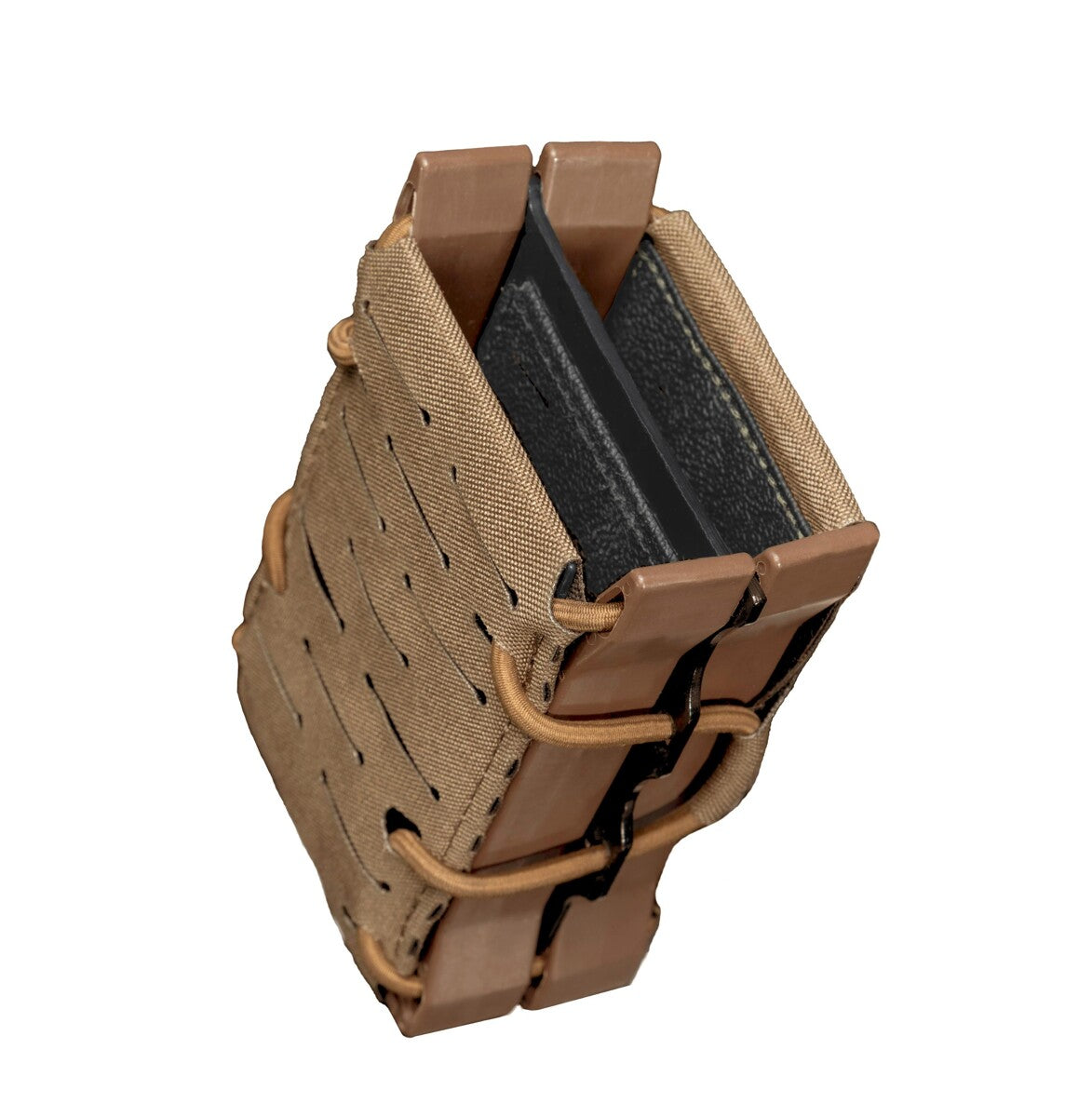 De binnenkant van de houder is bekleed met antisliprubber, dat in combinatie met de Shock Cord-regelaar het magazijn stabiel op zijn plaats houdt. De voorkant van de houder is voorzien van een polymeer versteviging.