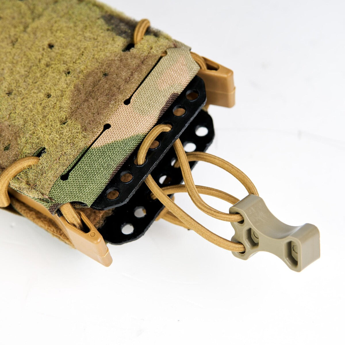 Laser cut curve plastic is integral part of this magazine pouch - holes can be used with shock cord with plastic pulled to provide additional magazine retention.